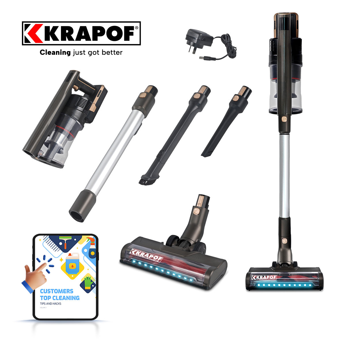I was a bit sceptical purchasing a non big brand name stick vaccum cleaner. But this KRAPOF cordless stick vac is amazing. I purchased this as a vacuum to take away in our caravan on our trips because of its light weight and included accessories. But instead of only using it in our caravan we now use it all the time in our house it performs as well as our Dyson pet vacuum and is lighter to use. The other big plus if any thing gets stuck up the vacuum tube it is easy to get out and get back to cleaning quickly unlike the Dyson vacuum which is a major operation to get any thing that is stuck in the vacuum tube out and can take half an hour to disassemble the vacuum to get the stuck item out. WELL DONE KRAPOF